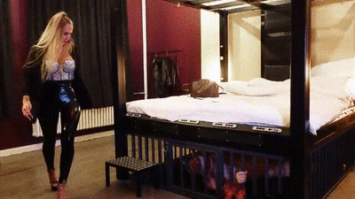 Nicht mal für die Fußdominanz darf der Loser aus seinem Sklavenkäfig kommen, nur sein Kopf schaut aus dem Käfig heraus. Zuerst muss er die High Heels seiner Goddess sauber lecken, dann darf er endlich die schönen Füße seiner Goddess genießen. Seine Zunge dient dabei als Waschlappen für die Fußsohlen. Mit ein paar Tritten in die Loserfresse und einem Smothering motiviert sie ihn, die Fußknebel und den Dreck zu schlucken. Der Fußsklave muss lernen, zu gehorchen und sich der Goddess total zu unterwerfen.